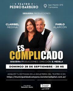 Los reconocidos actores protagonizarán “Es Complicado”. La función será a las 20 horas y las entradas se pueden adquirir en la boletería (San Martín 373) o en https://municipalidadcampana.boleteriadigital.com.ar Este domingo 28, a las 20, se presentará en el teatro Pedro Barbero “Es Complicado”, obra protagonizada por Claribel Medina y Pablo Alarcón. Los reconocidos actores …